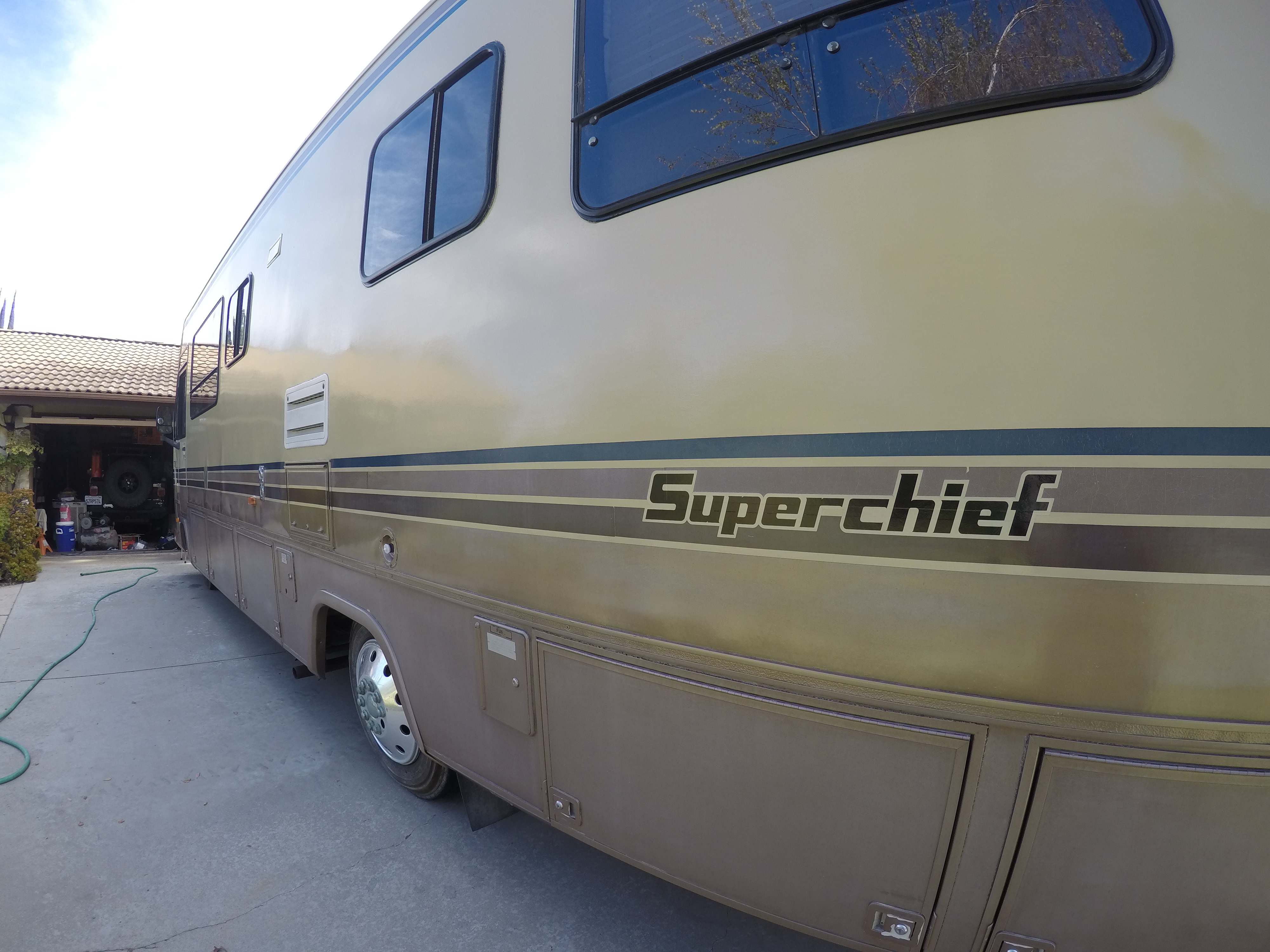 We have an old 1989 Winnebago Superchief that runs great, but the exterior looked dull and tired. After researching paint jobs and vinyl wraps that were out of our price range, my husband found a DIY polishing solution that, with a ton of elbow grease, shines up old RVs and helps repel dirt. This project took us two solid days to complete and about $100 worth of supplies. It’s best to wash/prep your RV on day one and apply at least one coat of polish, then come back on day two to finish applying 3-4 more coats of polish. The more polish you apply, the shinier and deeper the finish.